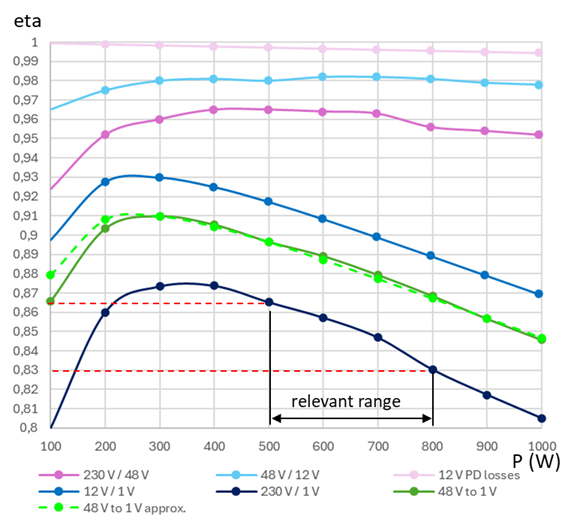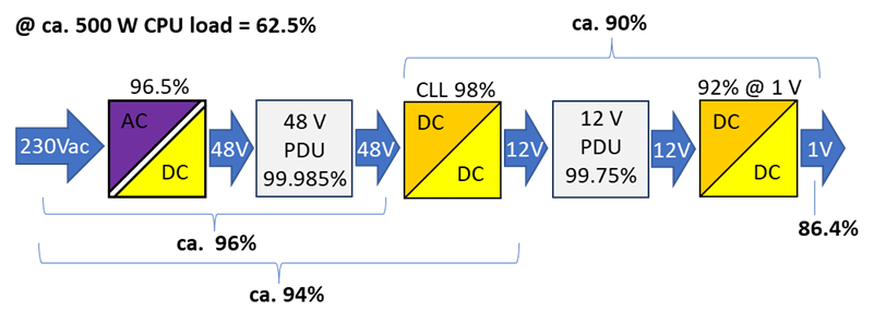 Aufgrund der sehr niedrigen Versorgungsspannung moderner CPUs und GPUs im Bereich von ca. 1 V und deren hoher Leistungsaufnahme von mehreren 100 W, ist es erforderlich, mittels sogenannter Point-of-Load DC/DC Wandler (PoL) die niedrige Betriebsspannung unmittelbar „vor Ort“, also direkt an der CPU oder GPU, bereitzustellen. Ansonsten würden zu viele Verluste durch die Zuleitungen entstehen. In konventionellen Hochleistungsrechenzentren sind CPUs und GPUs innerhalb von Servern installiert, welche wiederum in Racks verbaut sind. Hierfür hat sich als günstig erwiesen die Stromversorgung innerhalb der Racks mit einer Spannung im Bereich von ca. 48 V zu ermöglichen. Damit muss jedoch innerhalb des Racks die Spannung von zunächst 230 VAC auf 48 VDC heruntergesetzt werden und innerhalb der Server dann von 48 V auf ca. 1 V. Abbildung 1 zeigt in einem Blockdiagramm dabei typische zu erwartende Wirkungsgrade der einzelnen Stufen.