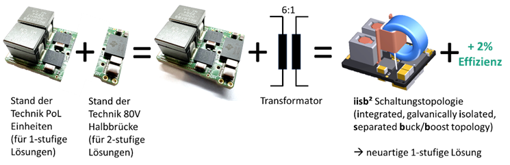 Im Rahmen von GreenICT wurde untersucht, wie durch eine besonders geschickte 1-stufige Umsetzung von 48 V direkt auf 1 V der Wirkungsgrad im Vergleich zu den gängigen 2-stufigen Lösungsansätzen verbessert werden kann. In Abbildung 3 ist der untersuchte neuartige 48 V auf 1 V PoL schematisch dargestellt, mit dem sich ein bis zu 2% höherer Wirkungsgrad im Vergleich zu typischen 2-stufigen Lösungsansätzen erzielen lässt.